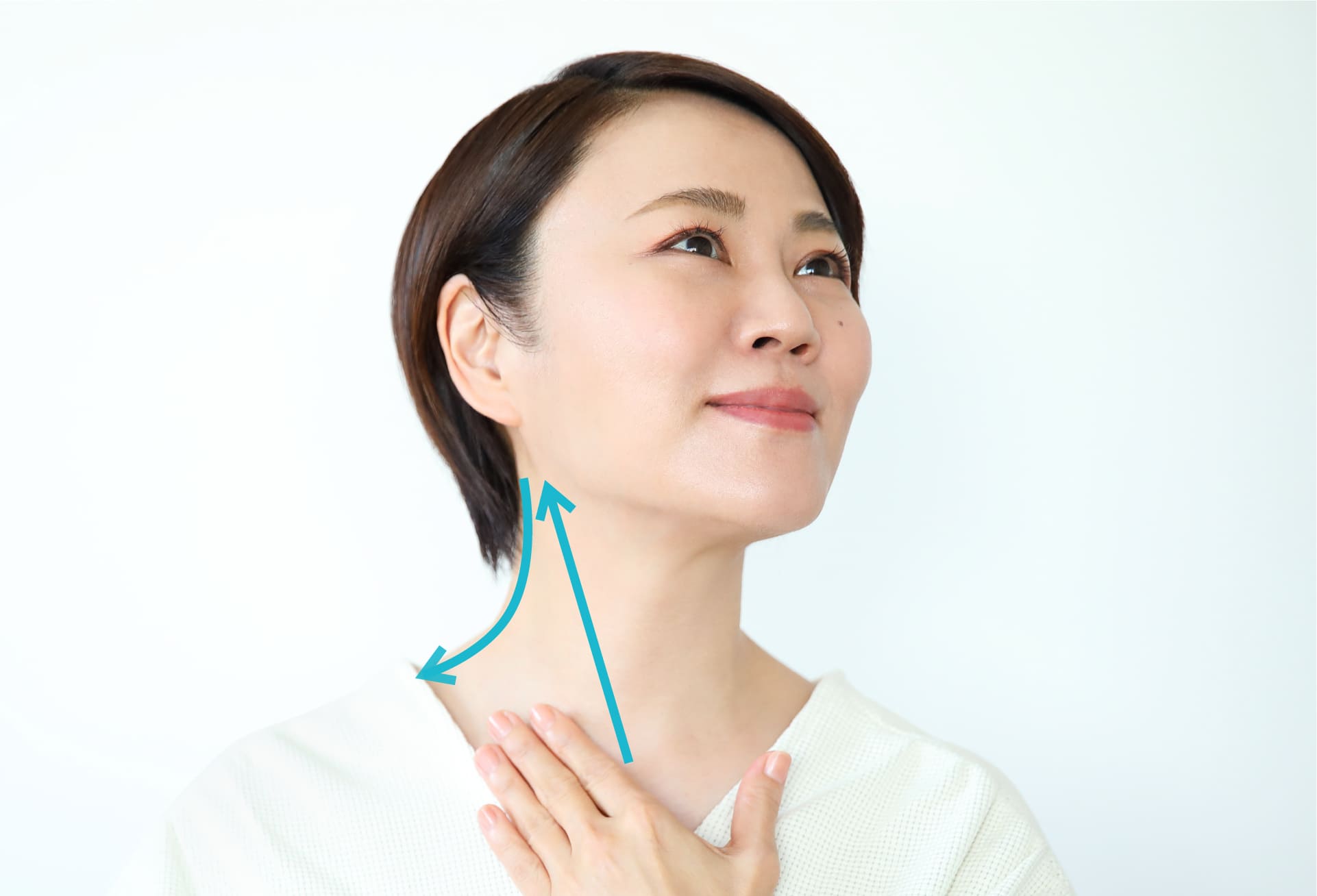 気をつけることは、「揉みほぐす」のではなく、「さする」こと。胸鎖乳突筋に沿って、指を下から上へさするようにすべらせて。