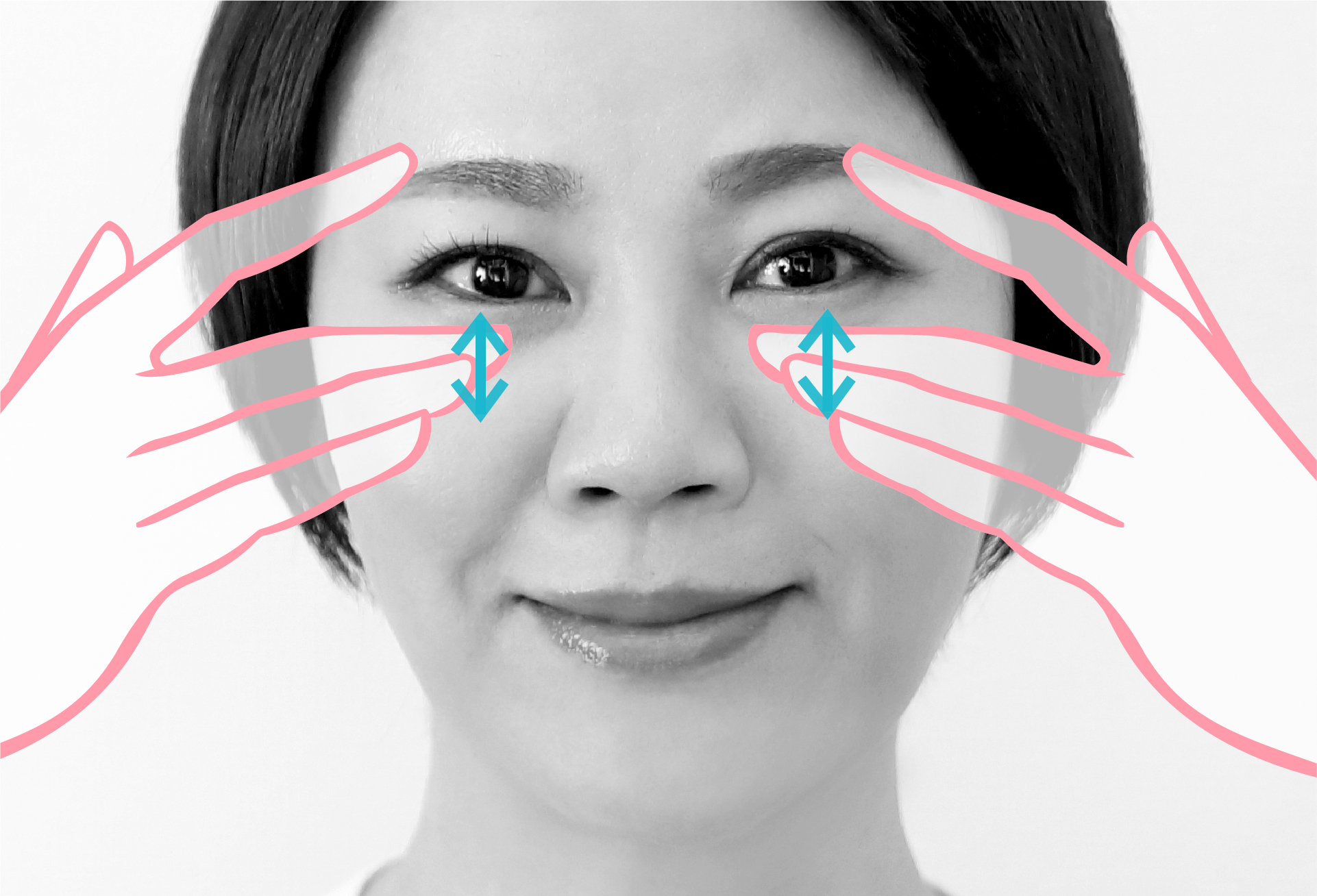 中指と薬指の腹を目の下に当ててじんわりと肌を温めた後、ゆらゆらとリズミカルに15回ほどおこないましょう。朝のメイク前や日中の軽いエクササイズにもおすすめ。