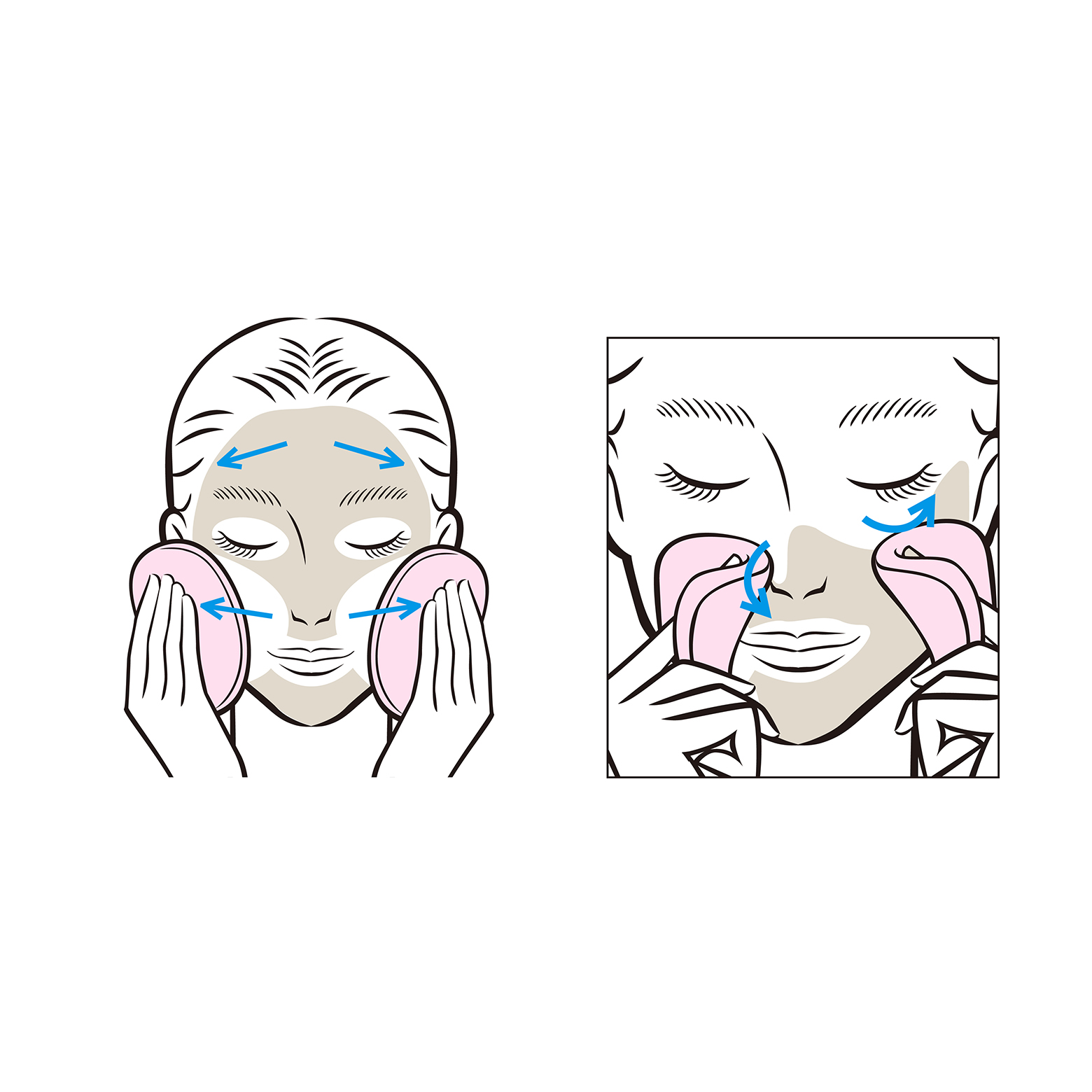 スポンジを使って、顔の中央から外側に向かって、やさしく拭き取ります。